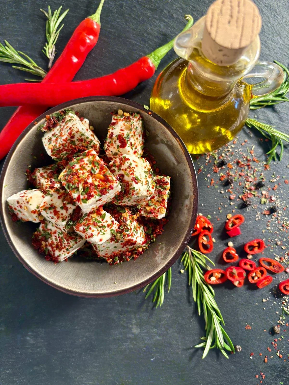 Schafskäse Würfel eingelegt in Chilli-Kräuter ohne Knoblauch