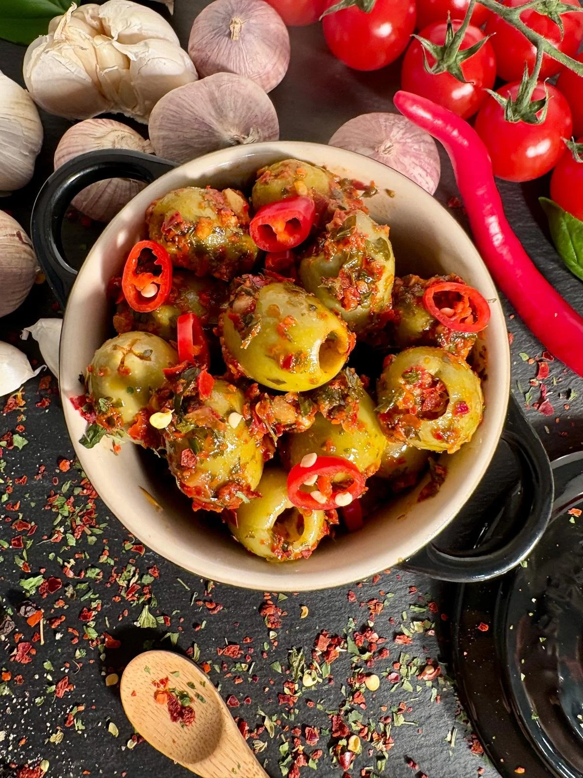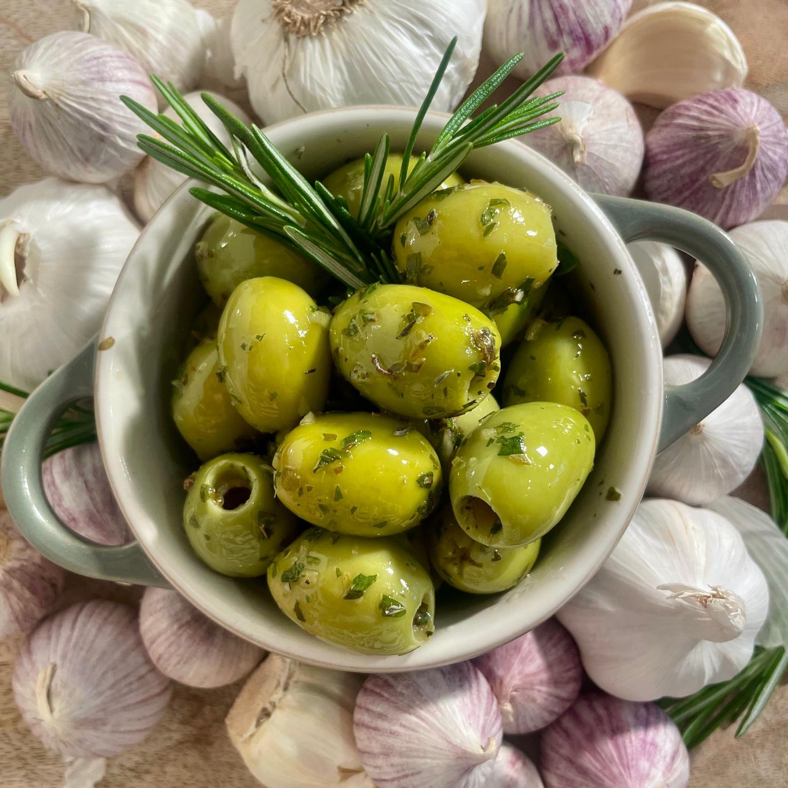 Grüne Oliven ohne Stein mit Chilli-Knoblauch
